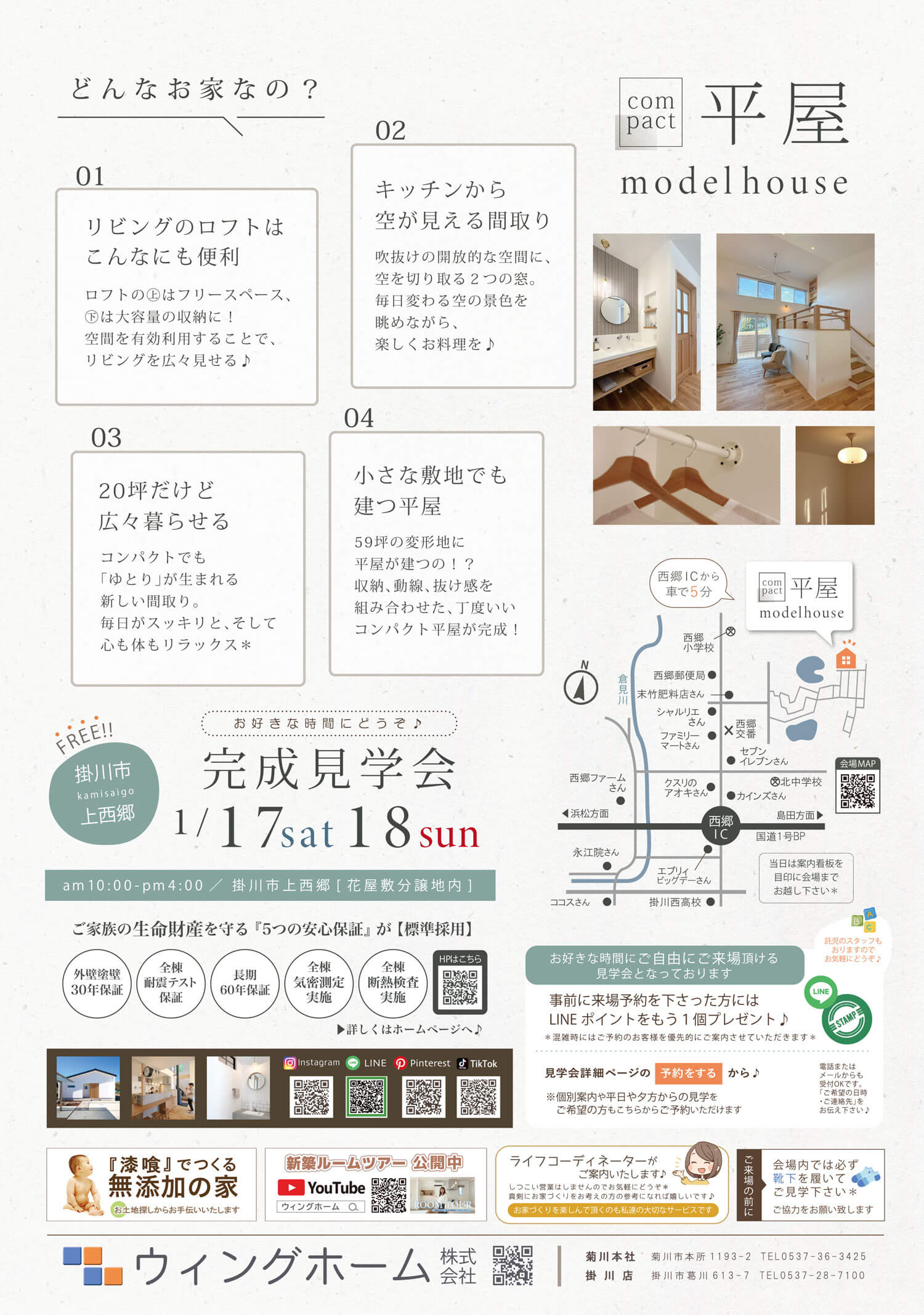 | 時間・場所 | :0:00~16:00【今回はお好きな時間にご自由にお越しいただける見学会です※ご予約不要】・掛川市上西郷【花屋敷 分譲地内】 |