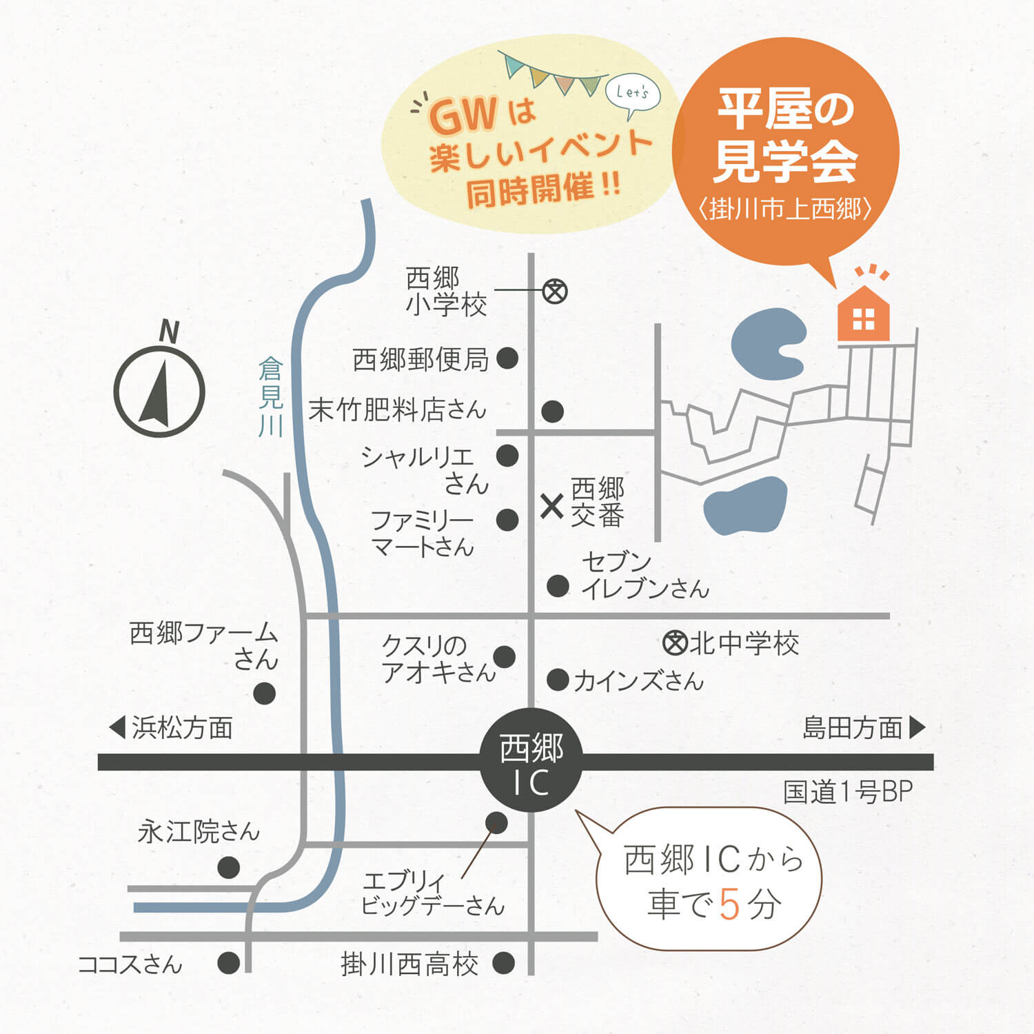 | 時間・場所 | :10:00~16:00【今回はお好きな時間にご自由にお越しいただける見学会です※ご予約不要】・掛川市上西郷【花屋敷 分譲地内】 |