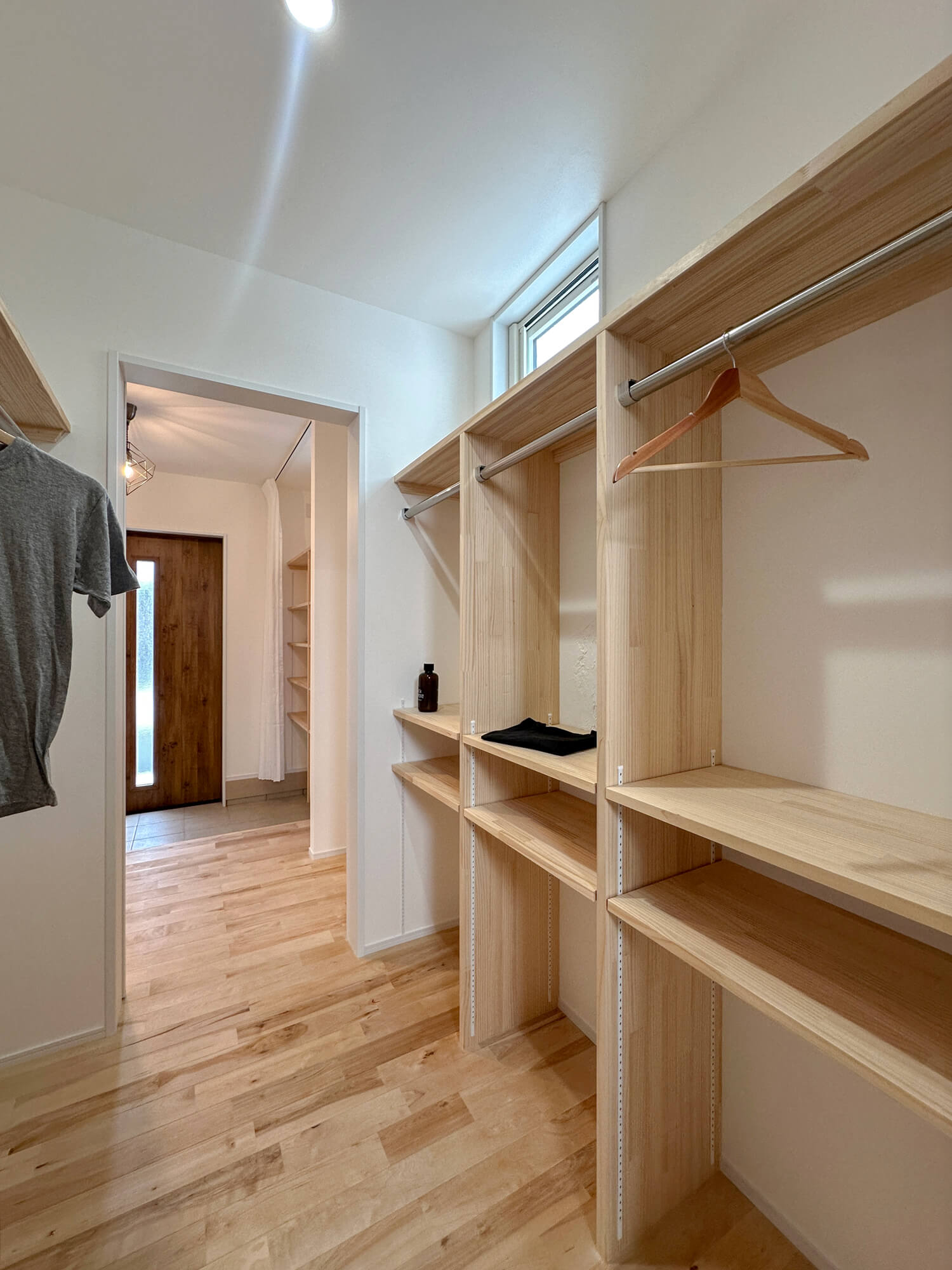 玄関から一直線。帰宅してすぐに部屋着に着替えて、手ぶらでリビングへ。家族みんなが使いやすい、便利なファミリークローゼット。