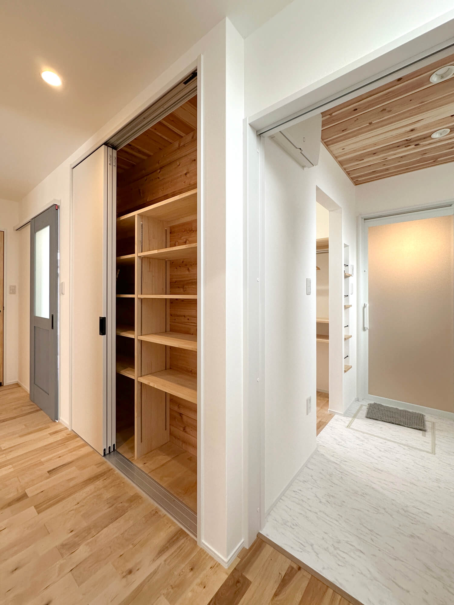 玄関、キッチン、水回りの中心に配置した万能収納。買い物動線も家事動線もスムーズに♪ここ一箇所で完結!