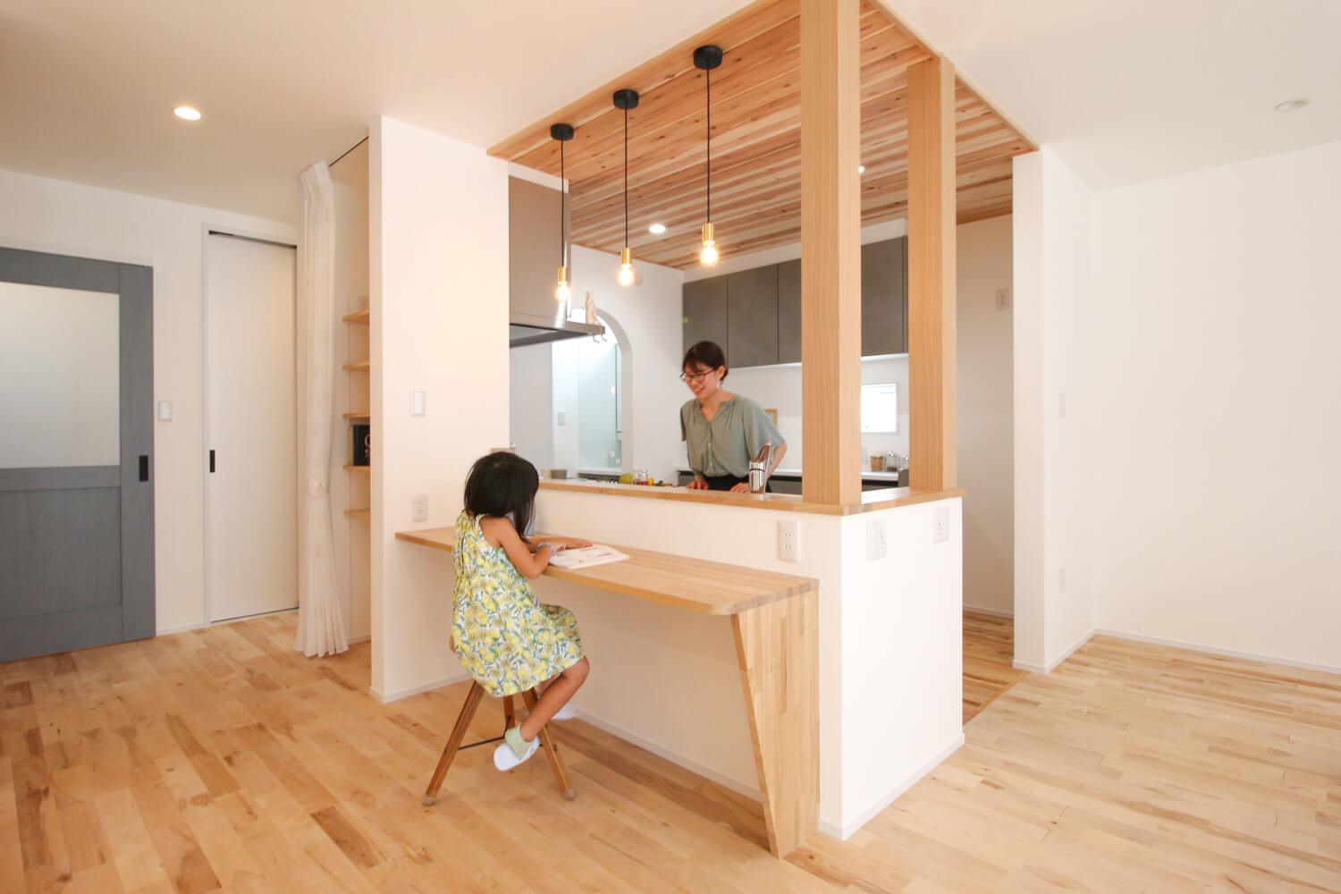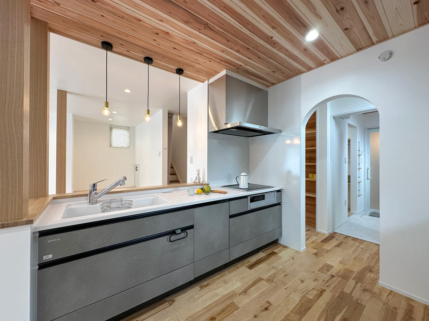 無垢板張りの天井とグレーが調和する、スタイリッシュなキッチン。アーチ壁の奥にはパントリーや水回りがあり、家事のしやすさを考えた機能的な動線が魅力的!