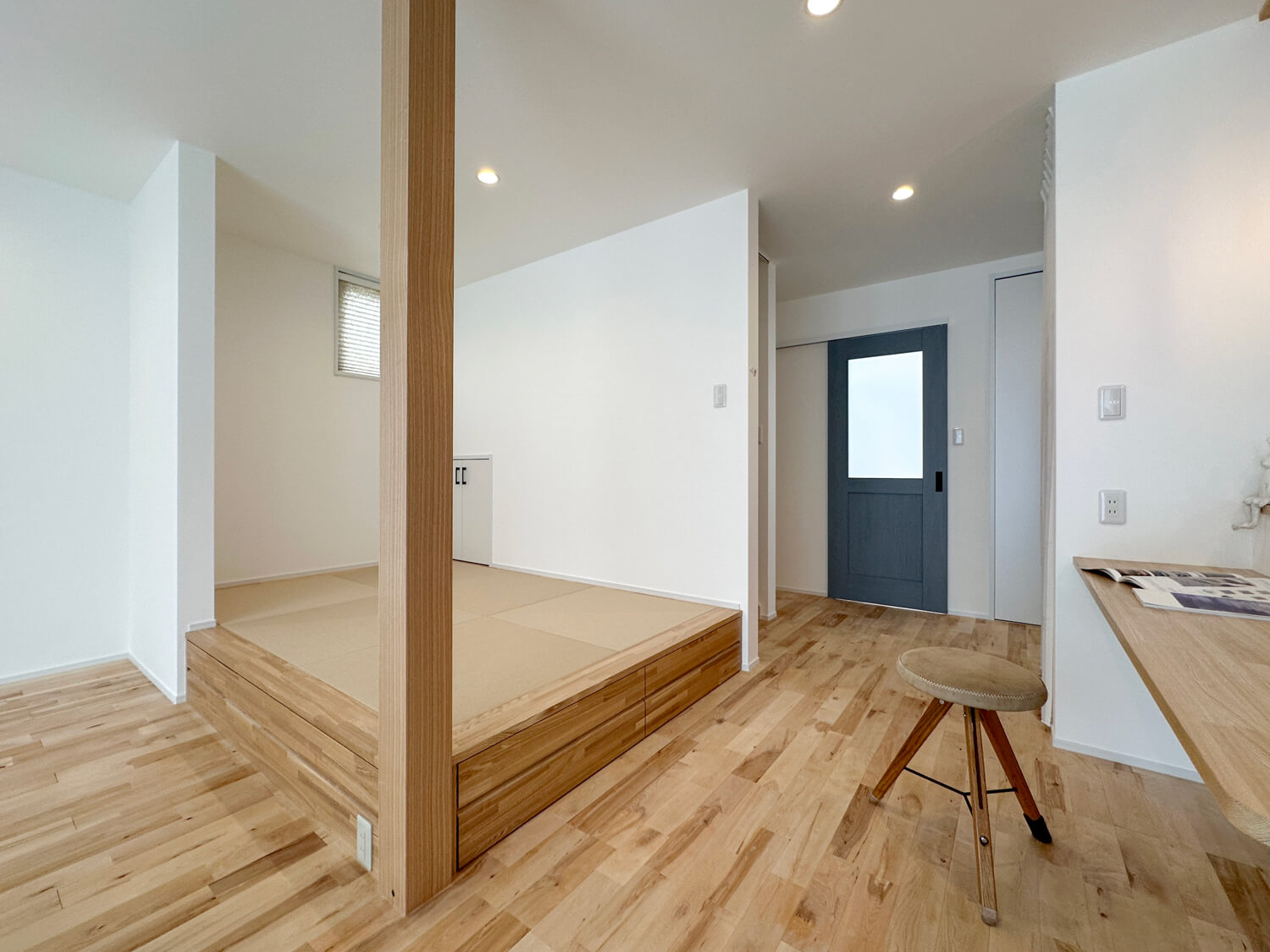 リビングの一角に設けた小上がりの畳コーナー。下部は便利な引き出し収納として活用でき、お昼寝や家族の団らんなど多目的に使える心地よい空間です。