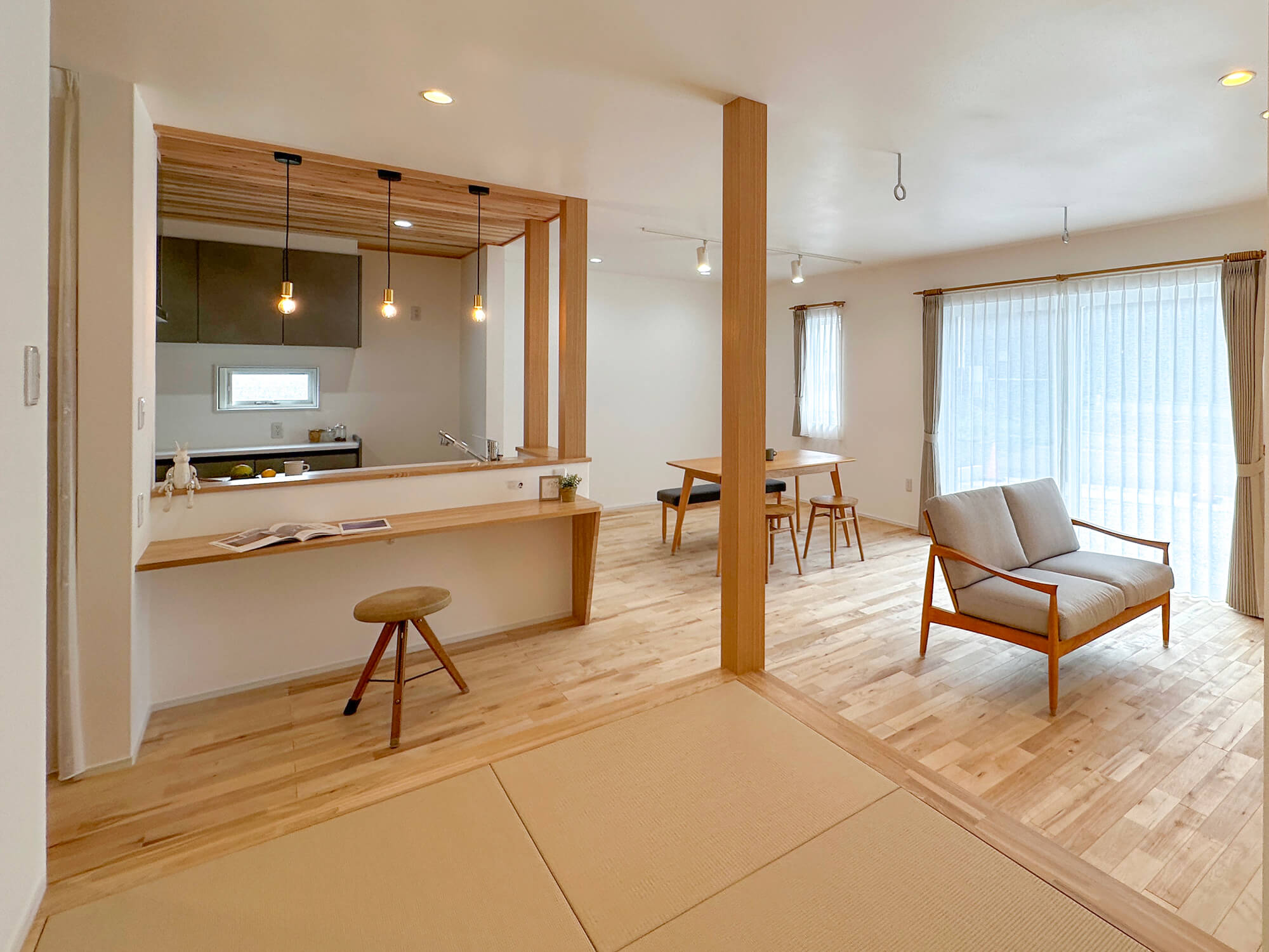畳スペースからキッチン、リビングまで見渡せる開放的なLDK。木の質感が心地よく、家族の気配を感じながらリラックスできる空間です。