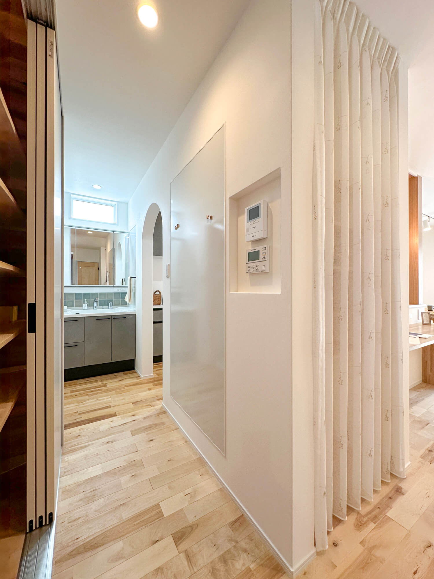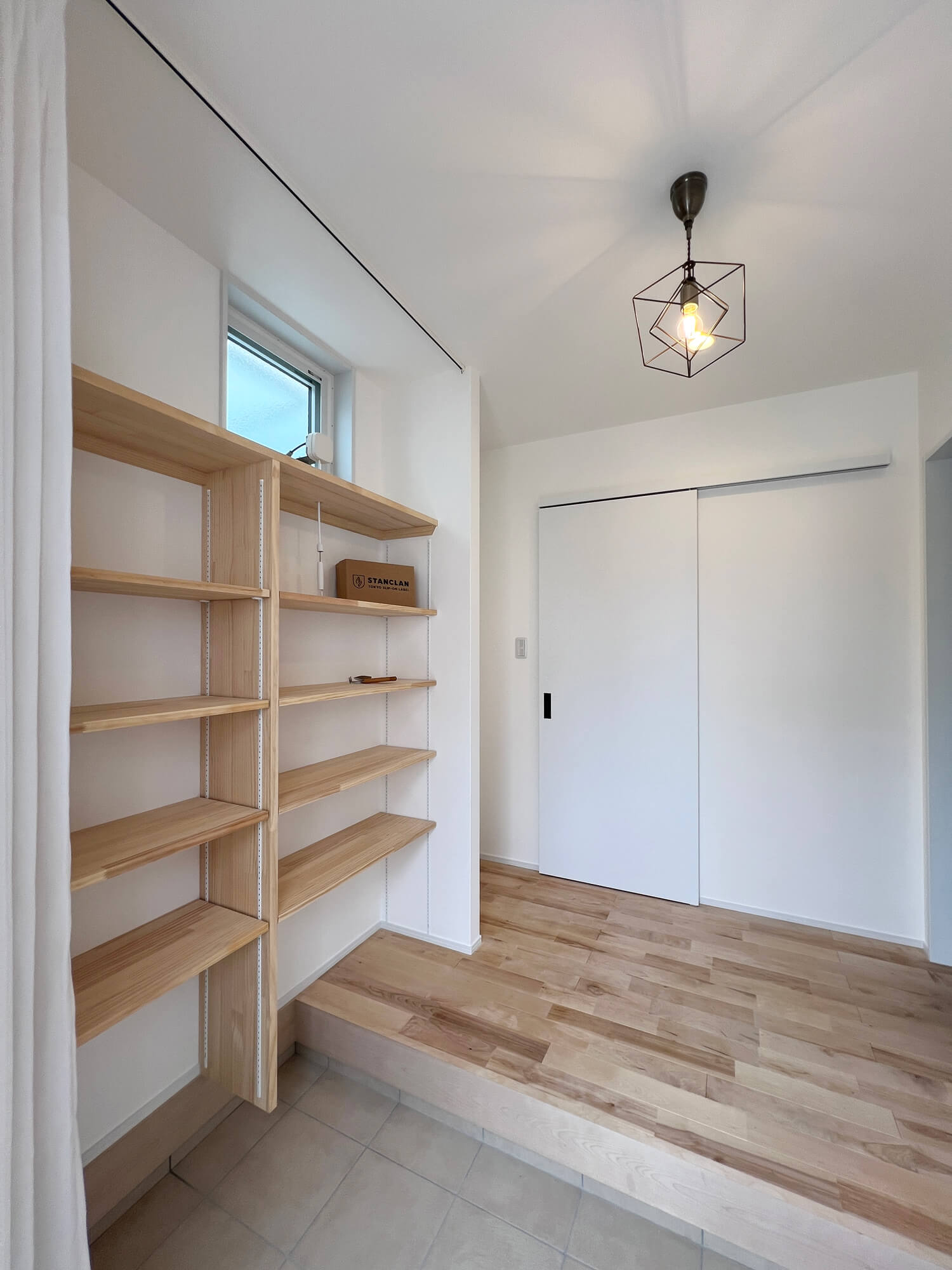 開放感のある玄関ホール。幾何学的な照明もシンプルな空間に調和し、とってもオシャレ!普段はオープンで使い勝手を優先し、隠したいときはカーテンで仕切れる便利な収納棚も魅力的♪