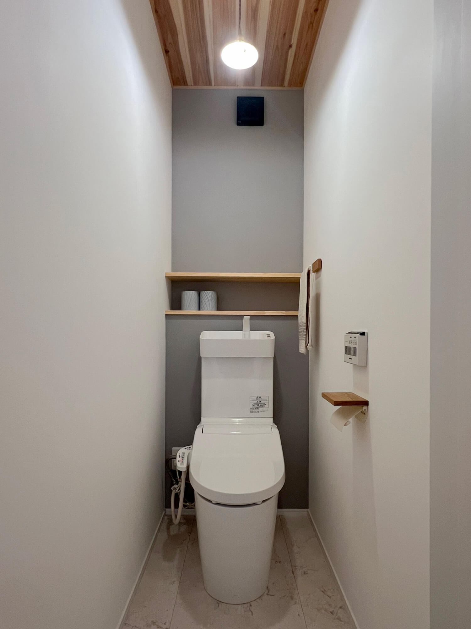 木目調の天井とグレーの色漆喰がアクセントのトイレ。