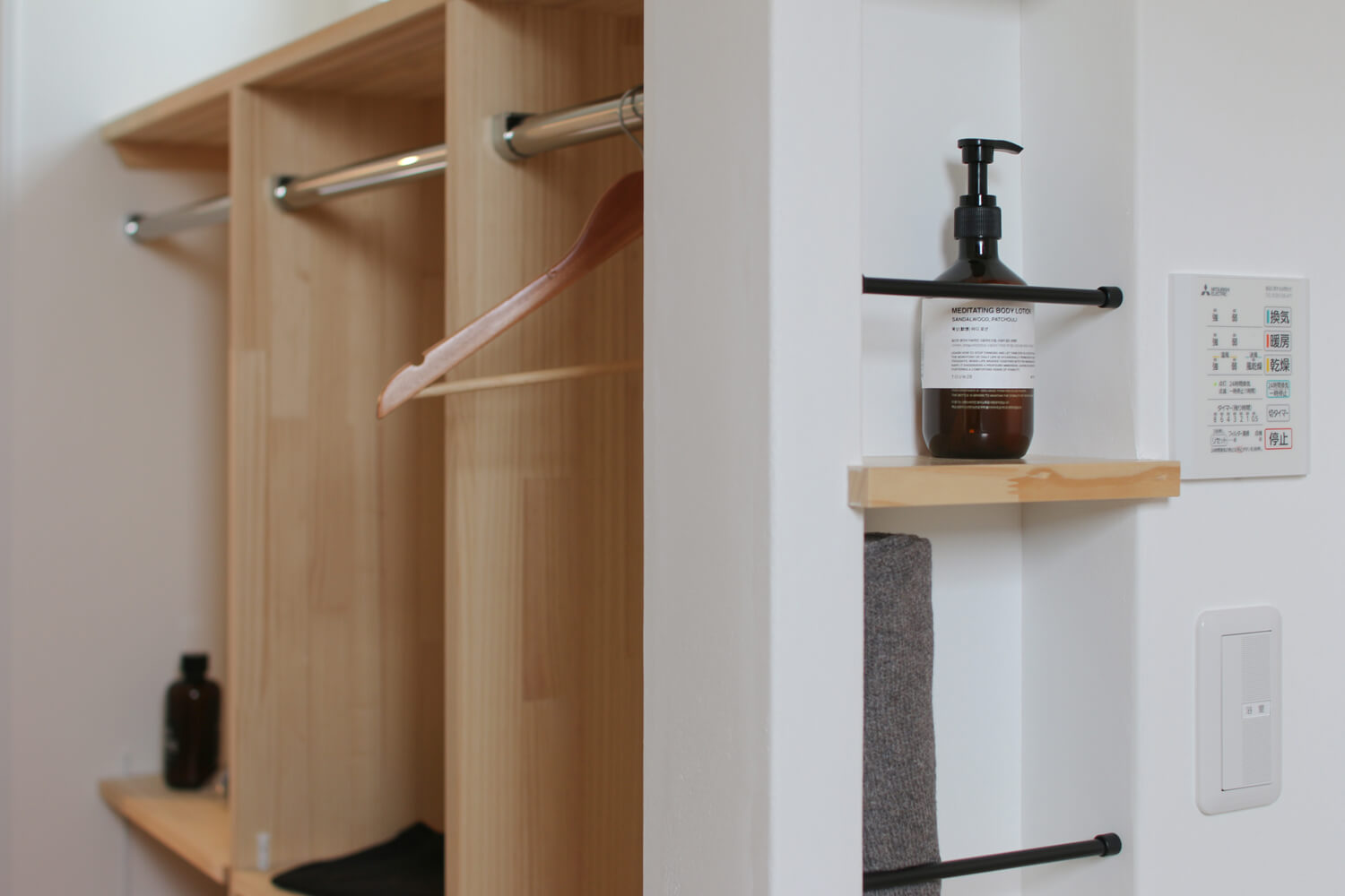 浴室を出てすぐに手が届く場所に設けた便利なニッチ収納。保湿クリームやバスタオルをスッキリと収められて、使い勝手◎。