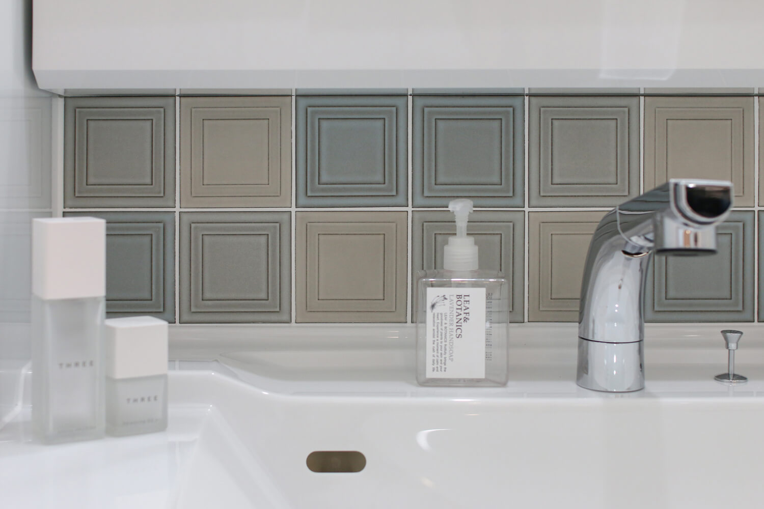 洗面台を彩るニュアンスカラーのお気に入りのタイル。スクエアのデザインが美しく、何気ない日常にトキメキをプラス♪脱衣室とは別空間なのも助かります♪