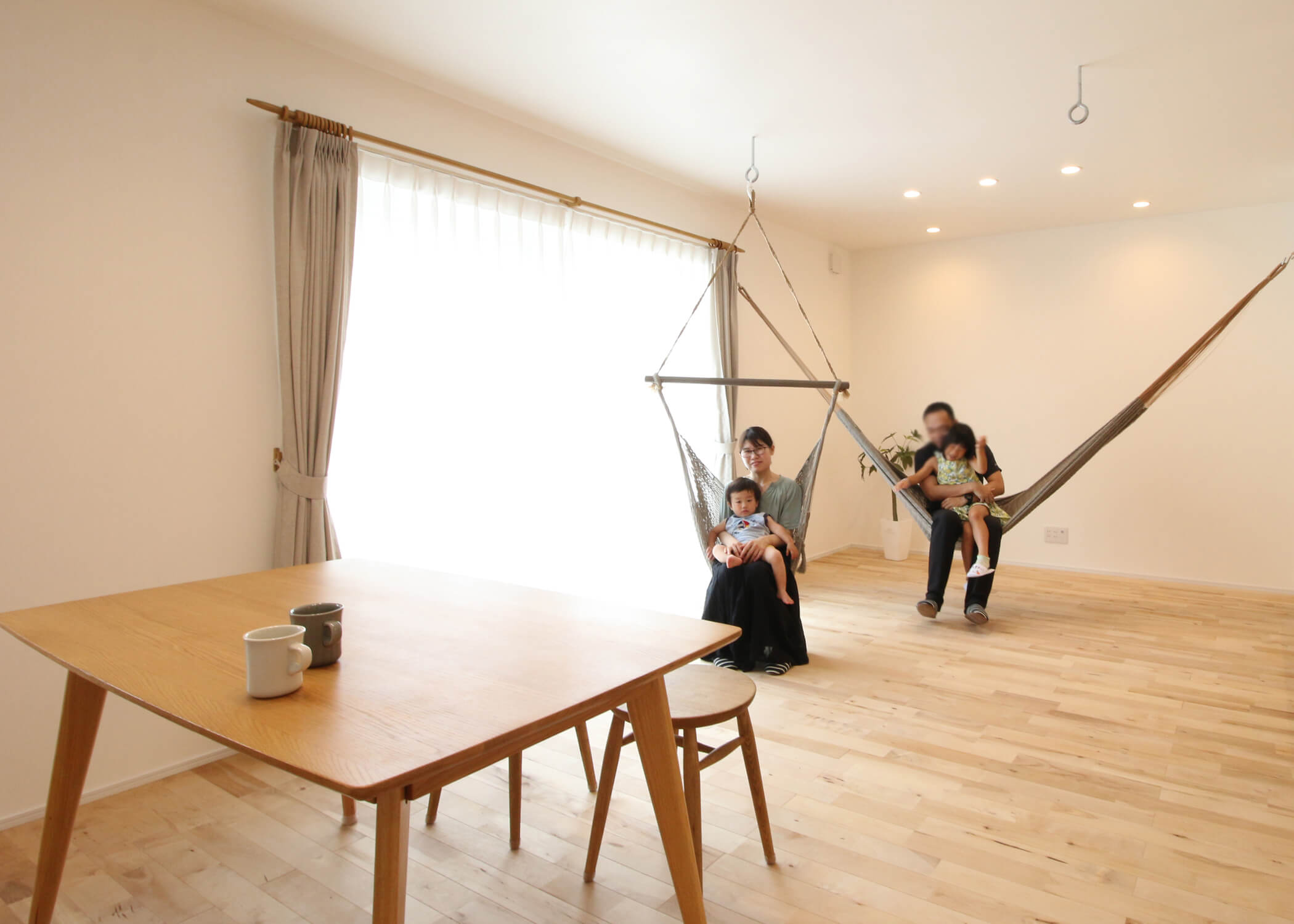 リビングに設置したハンモック。心地よい揺れに包まれて、家族みんなが笑顔でリラックスできる癒しの空間です。