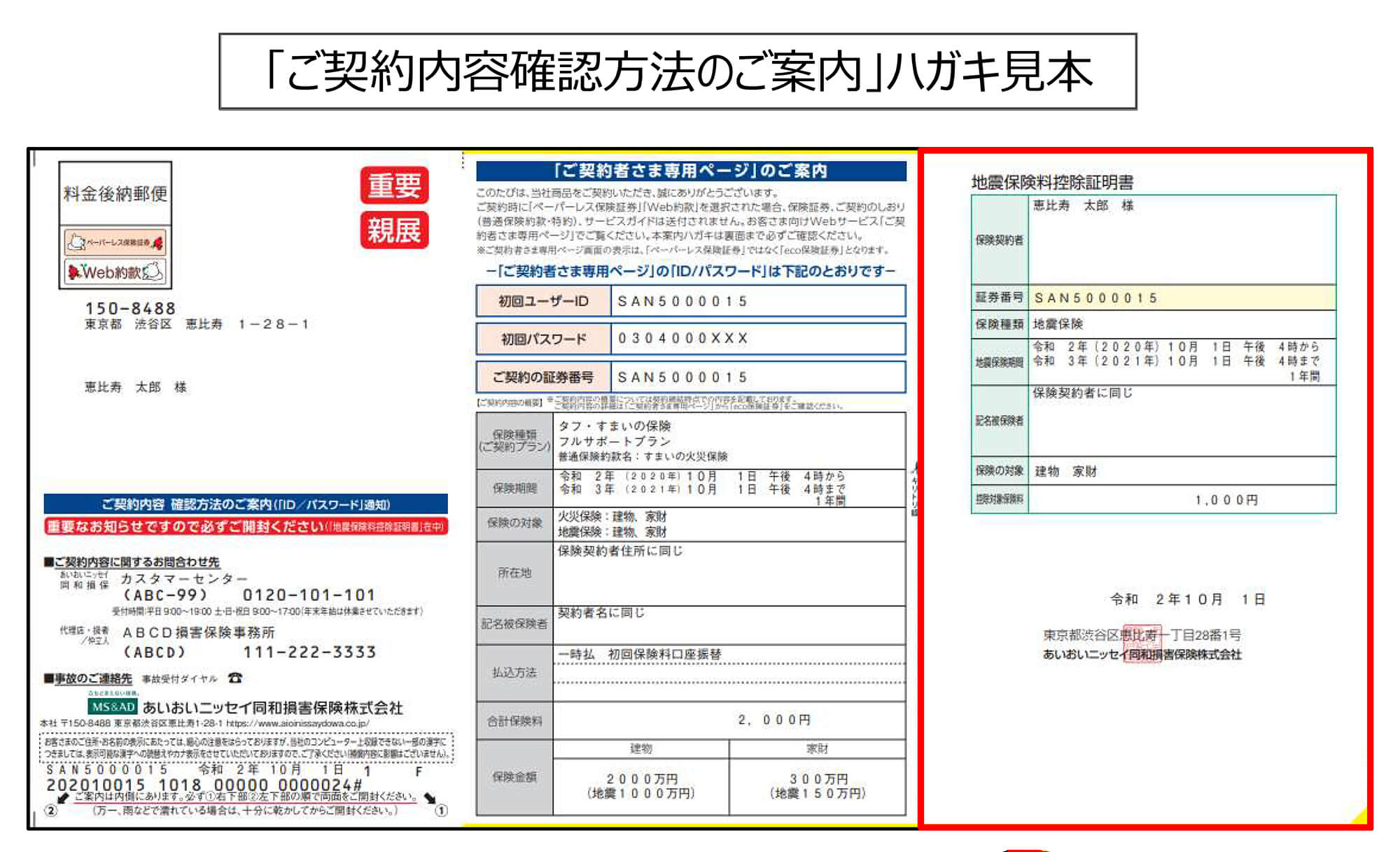 「ご契約内容の確認方法のご案内(ハガキ)」に「保険料控除証明書」を付属して