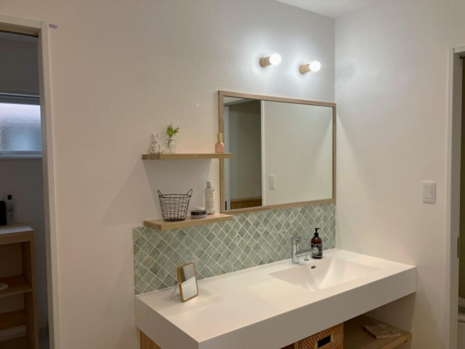 正面に貼られたタイル(クリクレア KUL-02)と造作ミラー枠、飾り棚の