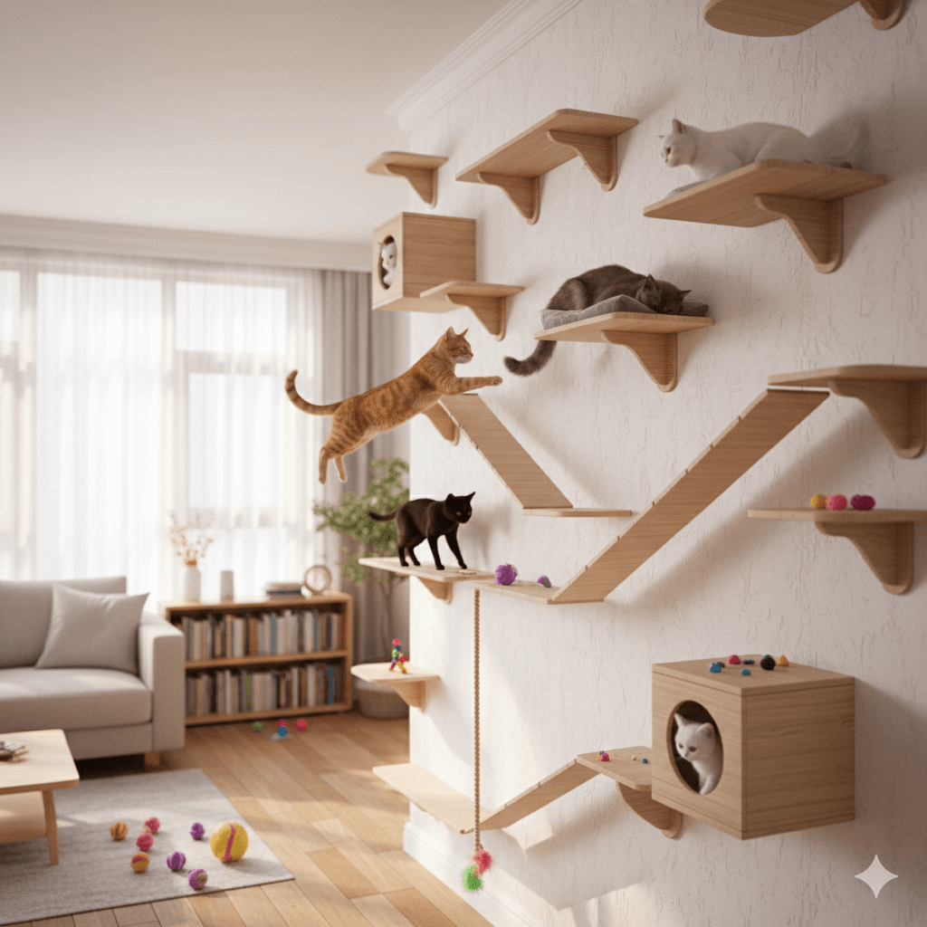 キャットウォークは付けたかったのですが…人間の暮らしの邪魔になるかも…と思ってしまって付けるのを辞めました。キャットタワーと階段で運動量は足りていると思います。