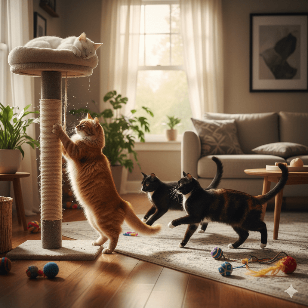 帰宅して猫のトイレ掃除と餌やりが基本のお世話です。遊びに関しては多頭飼いなので基本猫同士で遊んでくれるため、そんなに時間を取られません。