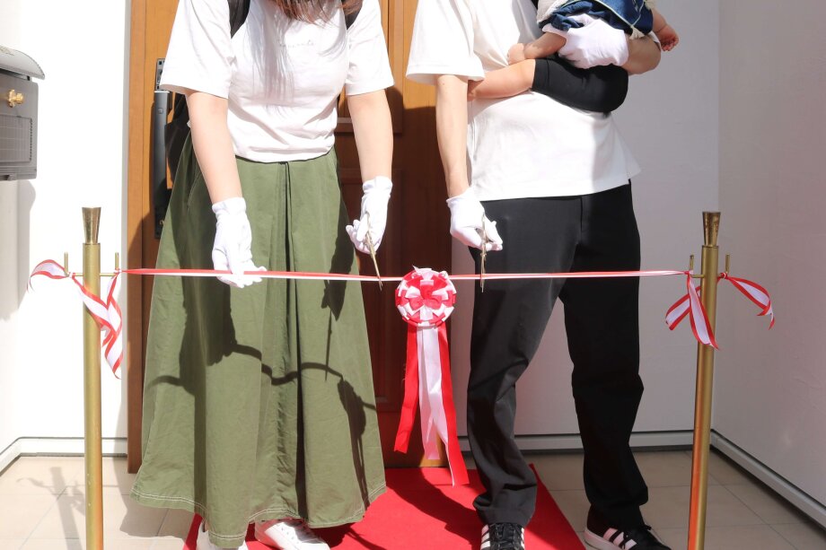 仲良くテープカットを行い、奥様Yさんが代表して新しい鍵でお家を開けてくださいました♪