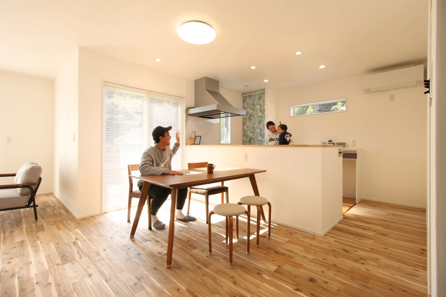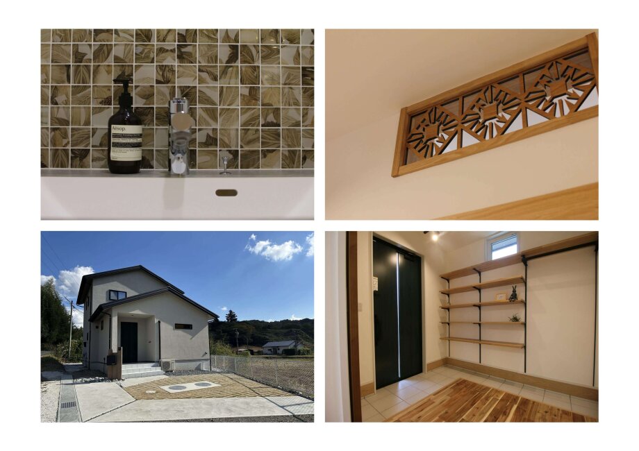 お家の中も、ご家族やご友人が遊びにきても見渡せるようになっているLDKや実際のお祭り柄をデザインしたオリジナルの組子細工、ボタニカルデザインの造作洗面やロールスクリーンなど