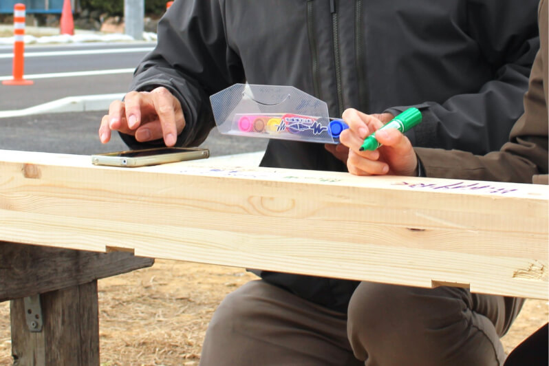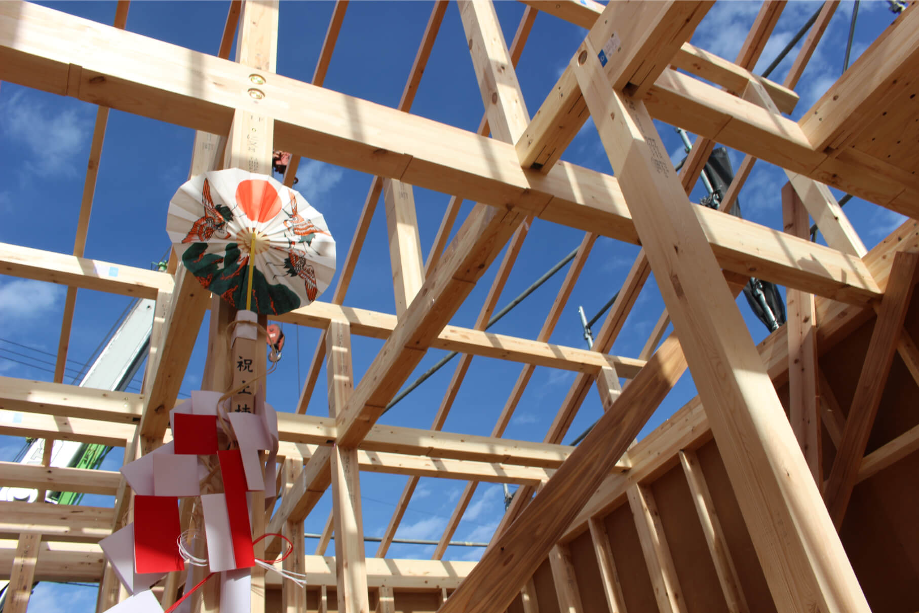 梵天(ぼんでん)やA様が書いた棟木が青空に映えていました*