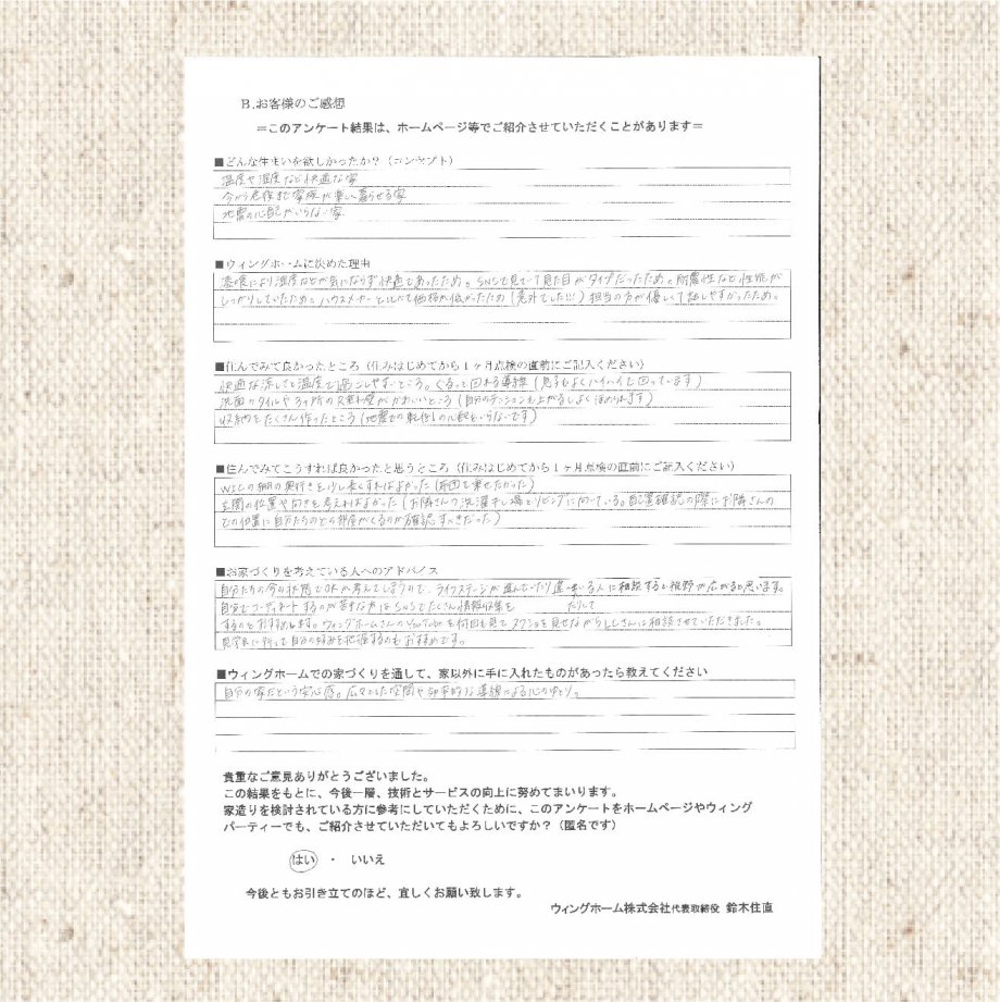 奥様:担当の川合さんの人柄も良かったし、会社の友人も川合さんが担当だったと聞いて安心できたのもあります。友人に「住んでいて微妙な点ってある?」ってあえて聞いてみたのですが、「気になるところ無いよ。」「漆喰で快適だし、匂いとかも気にならないし。」って返ってきて、マイナスな話が出てこなかったのも安心でした。