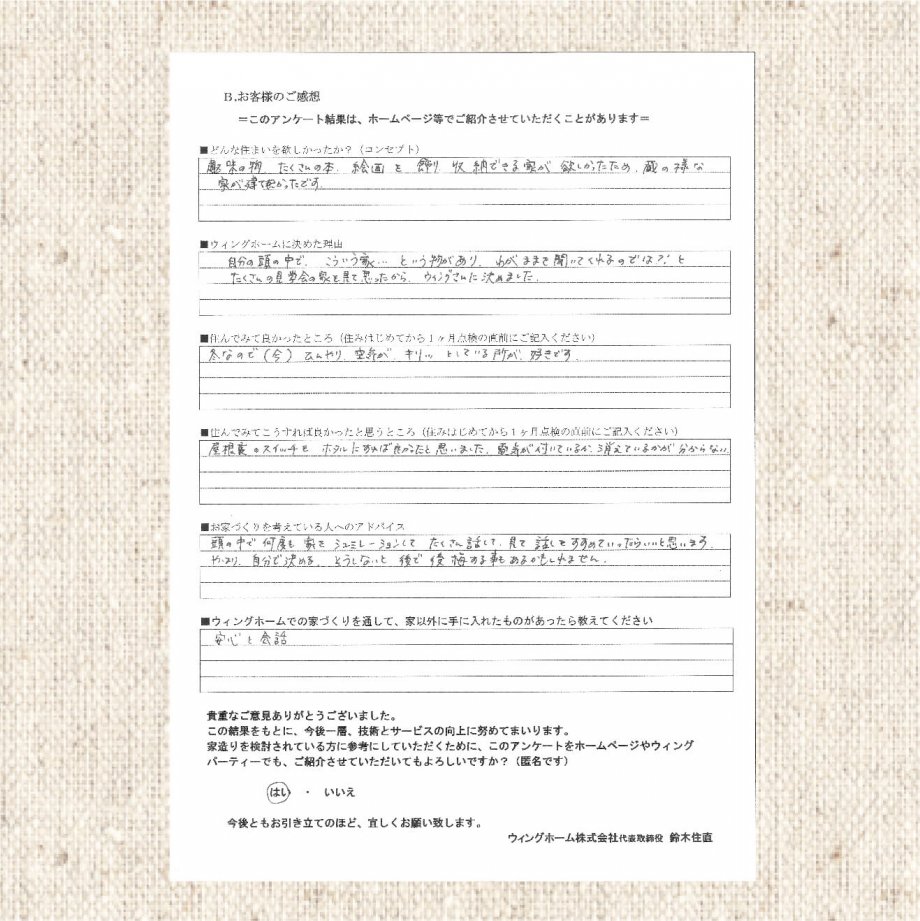 自分の頭の中で、こういう家…という物があり、わがままを聞いてくれるのでは?とたくさんの見学会の家を見て思ったからウィングさんに決めました。